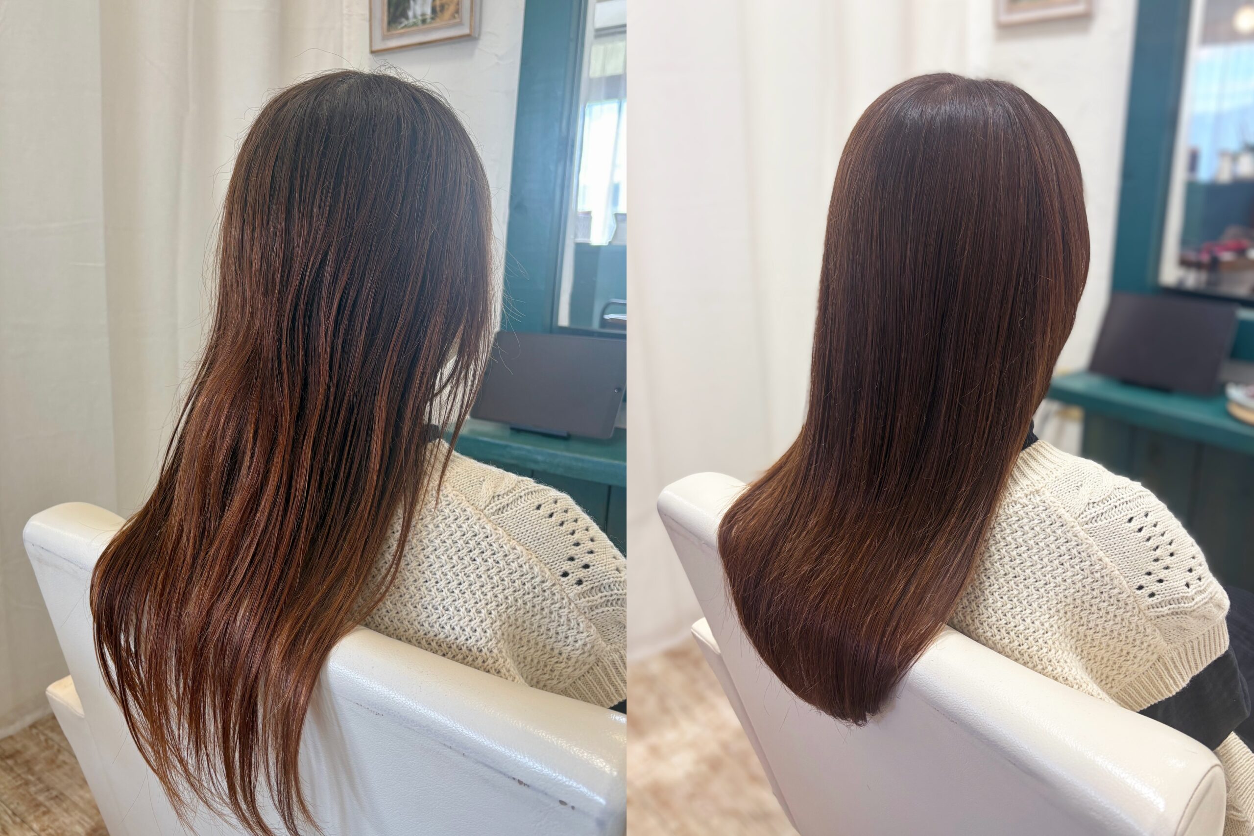 表参道のUmineko美容室で、プレミア髪質改善ケア・カラーリングを施術しました。「カラーやパーマを繰り返すうちに、トリートメントの効果を感じにくくなった」「う…