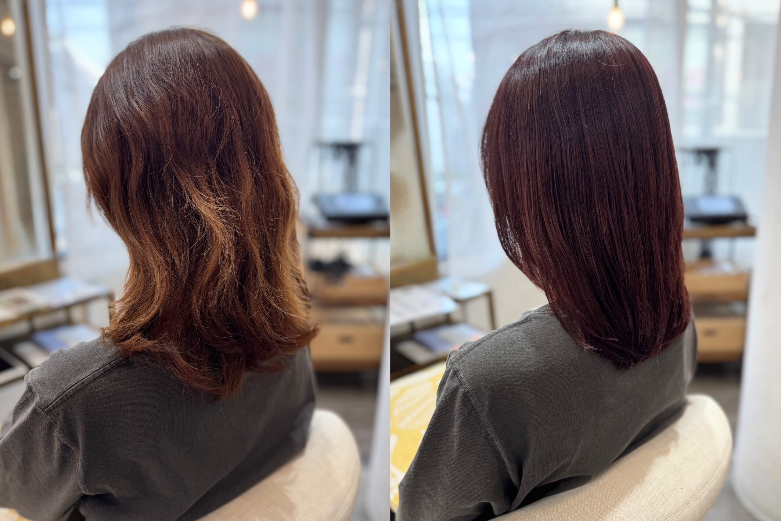 表参道のUmineko美容室で、プレミア髪質改善ケア カラーカットコースを施術しました。多毛・硬毛でごわつきや乾燥にお悩みのお客様。丸みのあるラウンドカットと赤…