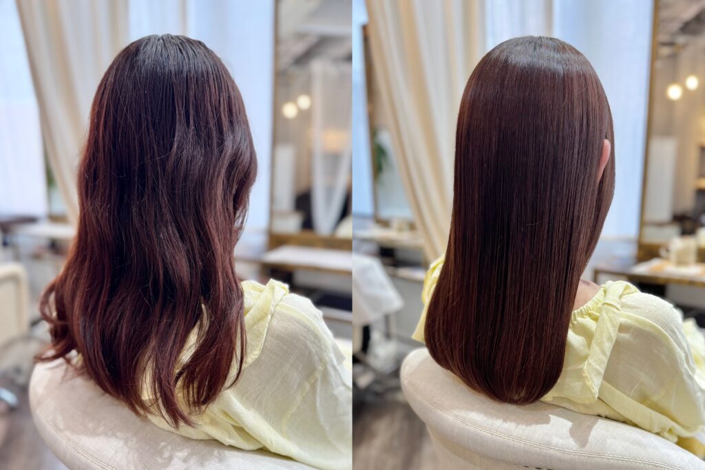 全体にはもちろん、特にダメージが気になる毛先を重点的にトリートメントを揉み込み、内部からしっかりと補修。髪質改善水素ケアで髪に必要な栄養を届けることで、ツヤとまとまりが戻り、柔らかなセミロングに仕上がりました。